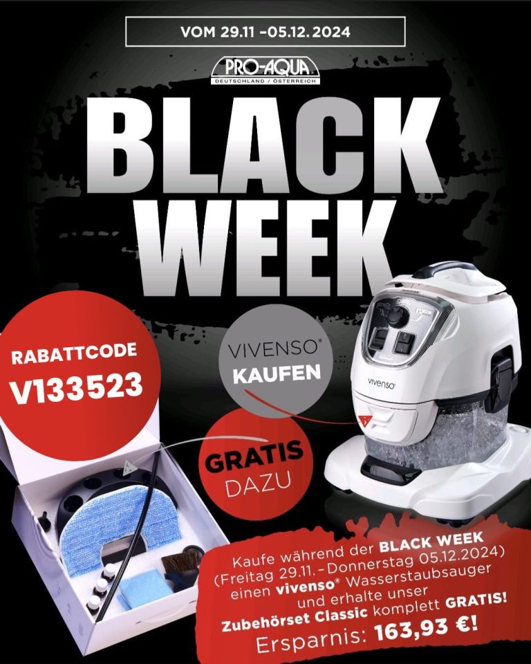 Vom 22.11. bis 29.11.2023 können Sie die Vivenso Black Week erleben. Highlight ist der Vivenso Wasserstaubsauger, der durch überragende Leistung und elegantes Design überzeugt.